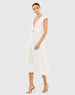 Stunning fully-pleated satin cap sleeve midi dress, designed with a flattering plunging V-neckline and a flowing pleated tea-length skirt. The dress is cinched at the waist with a non-removable belt featuring a chic gold metal buckle. Perfect for weddings, cocktail parties, or any formal occasion, this midi dress offers a sophisticated and stylish look.