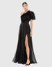 This stunning one-shoulder evening gown, featuring a dramatic layered ruffle bodice that adds elegance and flair. The flowing floor-length skirt creates a graceful silhouette, while the sexy thigh-high slit adds a touch of allure