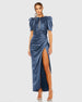 Stunning charmeuse column gown featuring a keyhole bodice detailing, puff sleeves, and a thigh-high front slit.