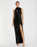Designed with a high neckline and sleeveless cut, our metallic jersey fabric gown is perfect for any formal occasion. Featuring a keyhole bodice cutout and thigh-high front slit, this gown is sure to turn heads with its stunning design and luxurious fabric.