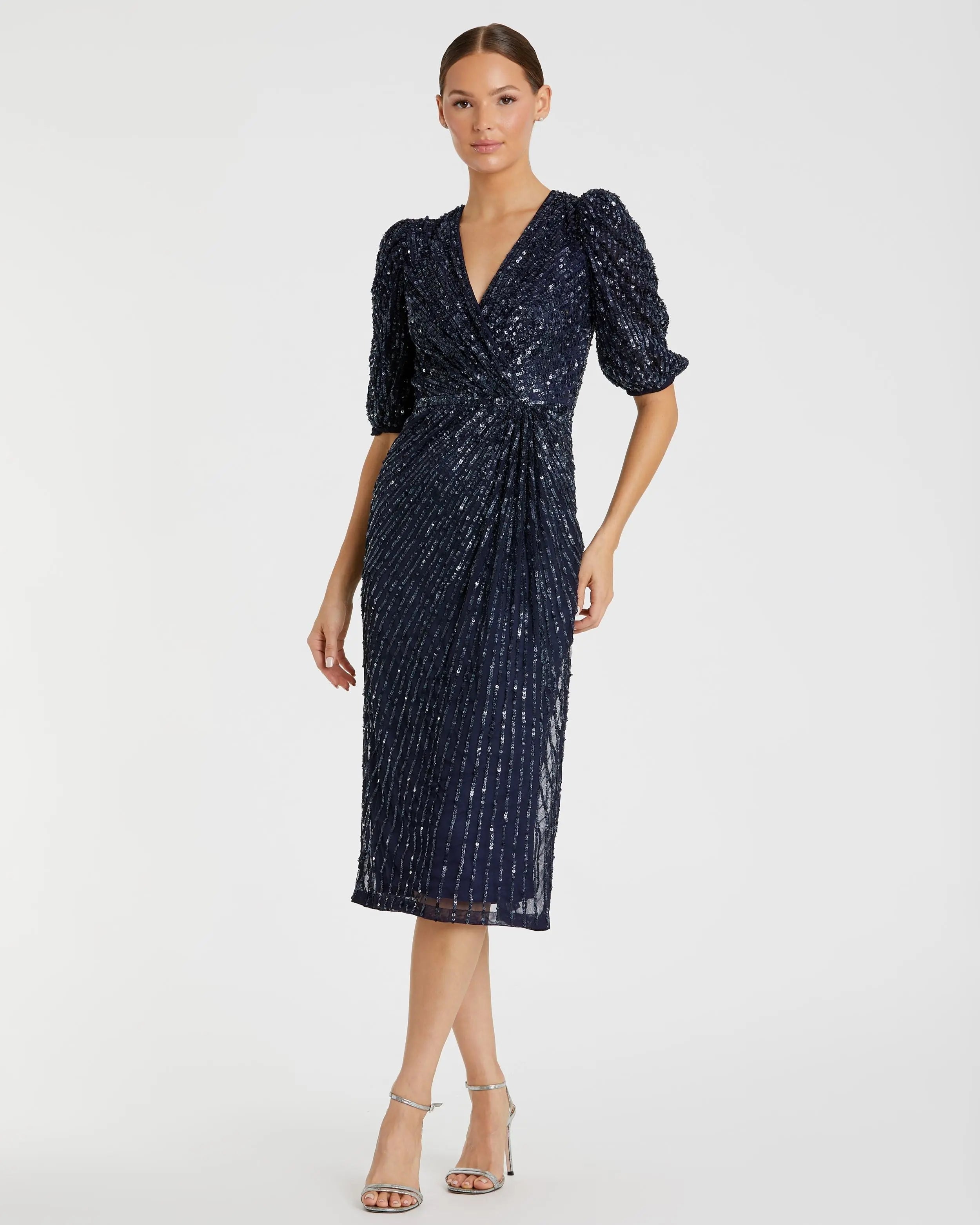 Navy Sequined V-Neck Short Puff Sleeve Midi Dress