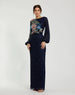 A timeless design, this gown dazzles with intricate floral sequin embellishments and delicate beading. Featuring a back vent slit and semi-sheer long blouson sleeves, it's the perfect choice for elegant soirees and formal events.