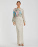 A timeless design, this gown dazzles with intricate floral sequin embellishments and delicate beading. Featuring a back vent slit and semi-sheer long blouson sleeves, it's the perfect choice for elegant evening and formal events.