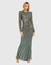 Made in an ultra-fine tulle fabric, this floor-grazing dress is embellished with rays of sequins. A sleek column shape with a high neckline and fitted long sleeves delivers a chic, contemporary look, while a beaded belt encircles your waist for a flattering fit.