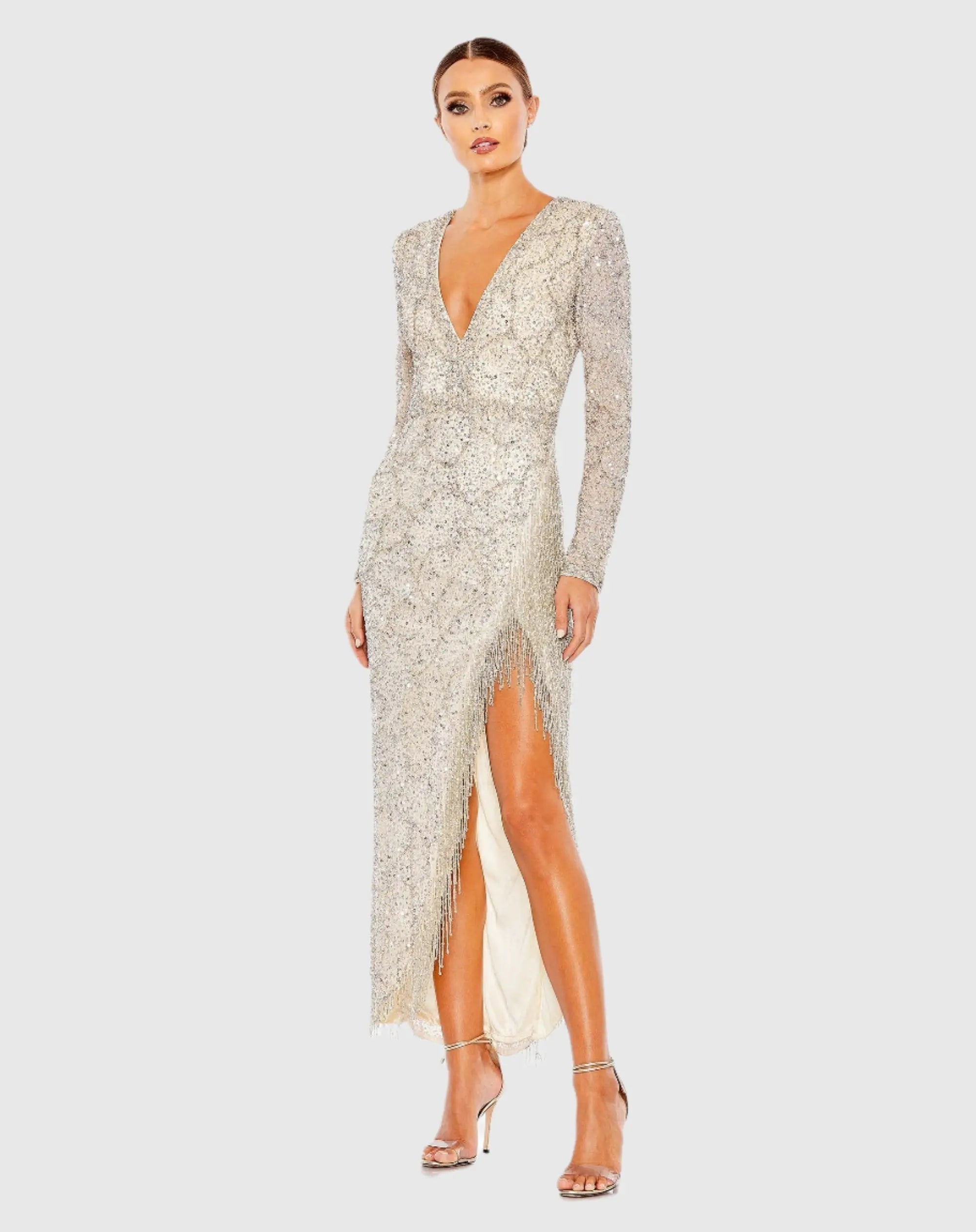 Silver Embellished Long Sleeve V Neck Beaded Hem Gown
