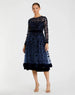 Navy Velvet Embellished Illusion Long Sleeve A-Line Midi Dress