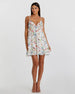 Flirty butterfly and floral print mini dress with a v-neckline, spaghetti straps, a criss-cross back, and a delicate ruffle hem.