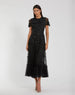 This stunning dress features an embellished sequin mesh overlay, adding a touch of sparkle and glamour. The fully-lined bodice provides comfort, while the sheer short sleeves create an ethereal, feminine look. With a high neckline and intricate floral appliqué adorned with beaded detailing, this dress is both elegant and eye-catching.