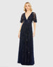 Embellished gown with v-neckline, short cape sleeves, and a flattering empire waist silhouette.