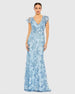 This elegant gown features intricately embroidered fabric, elegantly crafted to add a touch of sophistication to any event. The short flutter sleeves and v-neckline create a flattering silhouette, making this dress a perfect choice for formal occasions.