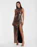 Designed with a high neckline and sleeveless cut, our metallic jersey fabric gown in mocha is perfect for any formal occasion. Featuring a keyhole bodice cutout and thigh-high front slit, this gown is sure to turn heads with its stunning design and luxurious fabric.