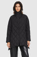 Cozy Down Filling; 2 Side Pockets; Side Swing Slit; Mid-length; Stand Collar; Snap Closure.