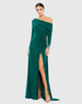 Off-the-shoulder long sleeve jersey gown accented with jeweled cuffs and a thigh-high slit.