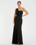Looking to achieve siren status? Enjoy your starring role as best-dressed in this divine mixed-media gown. Cut from smooth fabric in a sleek, body-skimming silhouette, the dress is accented with a single satin shoulder and pleated bow bodice. It’s punctuated by a sweep train.