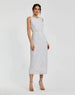 Chic sleeveless midi dress with rows of vertically-striped sequins throughout. Intricate, hand-beaded flowers adorn the bodice and skirt, and crystals accent the neckline and waist.