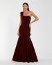 Sophisticated and striking, this velvet trumpet gown features a one-shoulder neckline with dimensional floral appliqué. The curve-hugging silhouette flares into a dramatic trumpet hem, perfect for black-tie events and formal evenings.